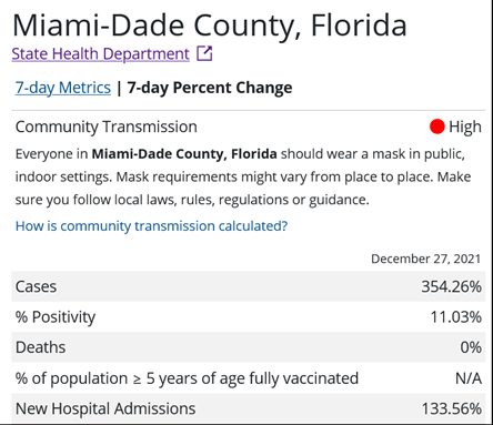 The first cases of the omicron variant were detected at a VA hospital in Tampa and in Miami. On December 2nd, 99% of the samples sequenced in Miami-Dade County were the delta variant. A week later, 80% were omicron. Despite having the highest percentage of people in the state at least partially vaccinated, there has been a 354% increase in cases there over the past seven days. This is one week after they experienced a 334% rise in cases. Almost 2% of the population tested positive last week; however, a positivity rate of 24% indicates the percentage of those infected is closer to 10%.