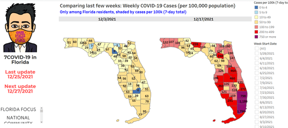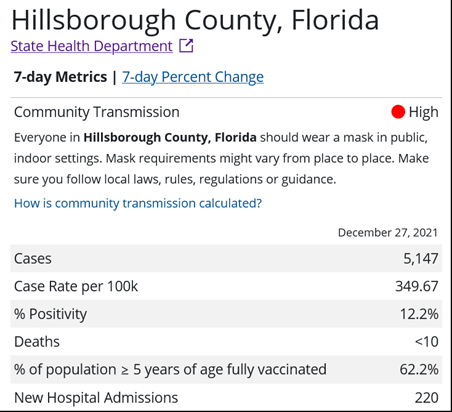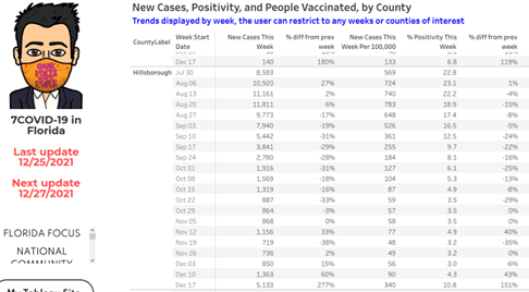 Dr. Jason Salemi, a professor from the University of South Florida, has been compiling data from the state since May 28th. His county-level data are quite helpful. Note that this runs one week late. It indicates that Hillsborough County rose from 90 cases per 100,000 people to 340 during December 11–17, 2021. On his site, you can click on the maps for detailed information on each county: