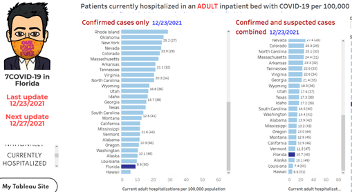 You won’t find any hospitalization information on Florida’s Weekly Surveillance Reports. Florida stopped reporting Covid hospitalizations on June 24, 2021. However, Florida must relay all hospitalization data to the US Department of Health and Human Services (HHS).