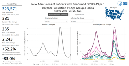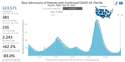 For August 1, 2020–December 23, 2021, Florida has had 322,956 new admissions for Covid patients. This represents 9.0% of all Covid admissions in the US for 6.6% of the US population: