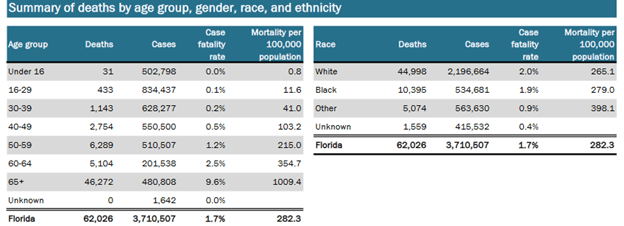 Since the pandemic began, 1% of all permanent Florida residents at least 65 years old have died due to Covid-19 (1009.4/100,000), almost 10% of people in that age group who tested positive: