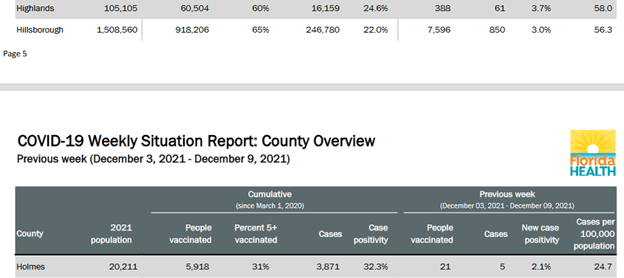 This data from November 26–December 2, 2021, came from Dr. Salemi’s archives. Since October 14th, my browser will not download the FL Dept of Health Weekly Report, citing it as a security risk. Nevertheless, you would not find any archived Covid information on the FL Dept of Health site: