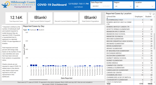In the Hillsborough County School District, there have been 12,064 cases during this school year as of December 9th. While only 99 cases were reported during December 3–9, this is a 57% increase from the prior week (63). It is concerning that the number of cases per day has doubled since the state report was issued. The school year began on August 10th, and the district instituted a mandatory mask mandate on August 18th. They ended it on October 15th.