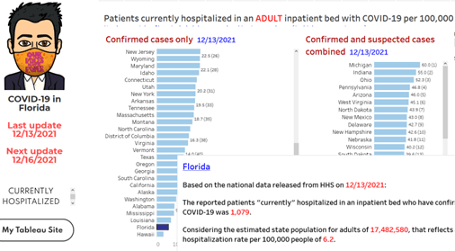 You won’t find any hospitalization information on Florida’s Weekly Surveillance Reports. Florida stopped reporting Covid hospitalizations on June 24, 2021. However, Florida must relay all hospitalization data to the US Department of Health and Human Services (HHS).