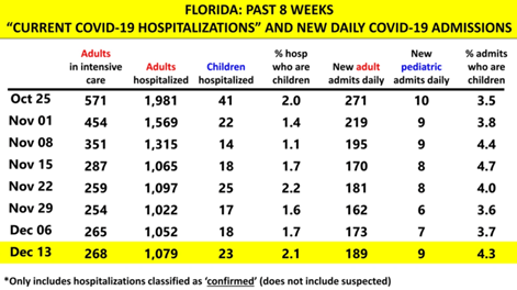 On December 9th, there were 0.78 new admissions/100,000 Floridians; 0.70 the week before. The discrepancy with last week’s report is due to the CDC removing 47,785 hospitalizations, as noted above: