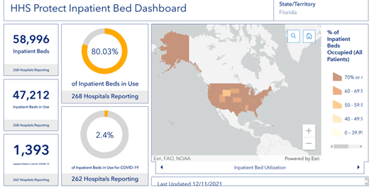 HHS tracks Hospital Utilization. On December 2, 2021, 80% of hospital beds in Florida were full, up 1% from last week (1,393). The Covid patients accounted for 2% of utilized beds. However, last week, there were 1,343 hospitalized Covid patients, an increase of 4%. Five weeks ago, hospitalizations dropped 35%.