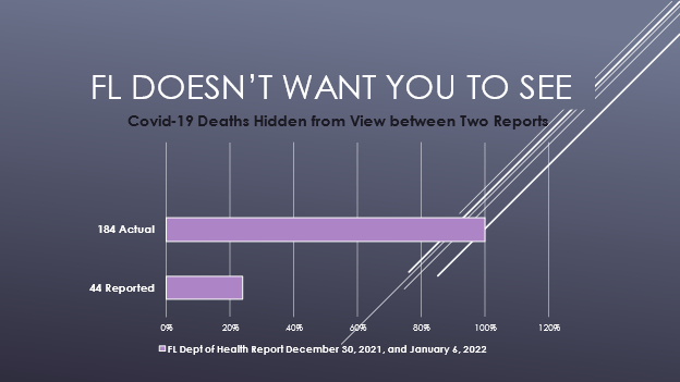 Last week, the number of deaths among permanent residents reported to the state of Florida increased by 14%. The state is claiming only 24% of the Covid-19 deaths during the past week as “New Deaths” (44 of 184). Between April 1, 2021, and January 6, 2022—when vaccinations were available to all Floridians over the age of 16—10.3% of all Covid-19 deaths have occurred in Florida, a state with 6.6% of the population.
