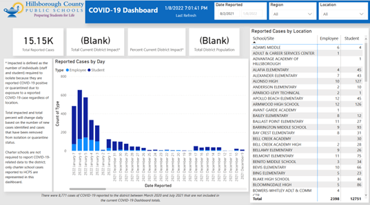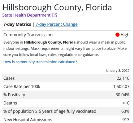 In the Hillsborough County School District, as of January 6, 2022, there have been 14,740 cases during this school year. The 2,062 cases reported during December 31–January 6 constitute an 860% increase from the last week of the fall semester week (215 during December 10–17, 2021). This school year began on August 10th, and the district instituted a mandatory mask mandate on August 18th. They ended it on October 15th. Florida law now leaves the decision about quarantining after a close contact at school to the child’s parents.