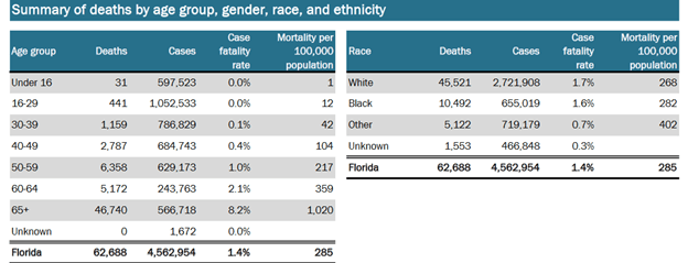 This data from December 24–30, 2021, came from Dr. Salemi’s archives. Since October 14th, my browser will not download the FL Dept of Health Weekly Report, citing it as a security risk. Nevertheless, you would not find any archived Covid information on the FL Dept of Health site: