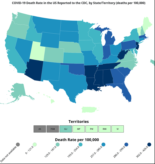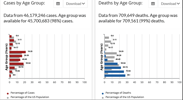 Two weeks ago, Florida improved from the deepest shade of blue for the first time since I began downloading this graphic. If you go to the CDC’s site and click on Florida, you will see that only 23 deaths are reported for the last 7 days, despite 184 occurring during December 31, 2021–January 6, 2022. The other large states have much higher numbers for the week. For the first time that I have seen, we have dropped to the second highest proportion of Covid deaths among the six largest states: CA (193); TX (259); FL (291); NY (217); PA (293); IL (249).