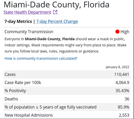 Miami-Dade County was one of the first places in the state to detect the omicron variant. On December 16th, 80% of samples sequenced there were the omicron variant. Only two weeks before, 99% had been the delta variant. Look at what has happened there in the seven days before January 6th: