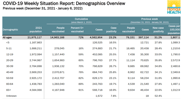 On the January 6th report, Florida reported 4,562,954 cumulative cases. Of those, 397,114 were reported as new, a 33% increase from the prior week (298,455). Hillsborough county experienced a 47% rise. Over 68,000 new cases are in Floridians under the age of twenty. With a statewide positivity rate of 31%, there were as many as 5 times the official number of permanent Florida residents infected with SARS-CoV-2. Compared to four weeks ago—when the omicron variant was first detected—Florida has experienced a rise in new reported cases of 2,852%.