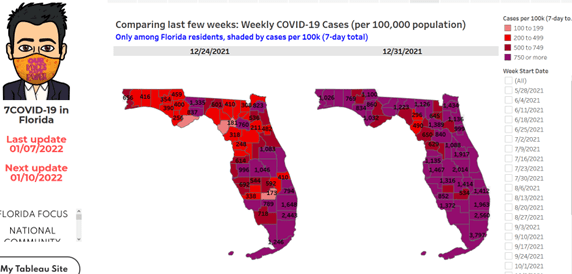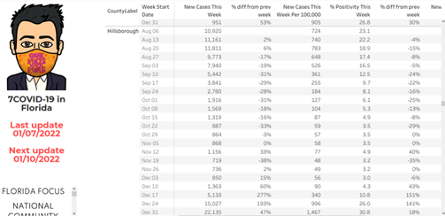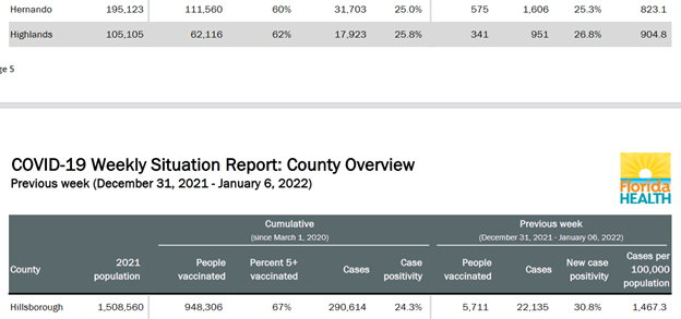 Dr. Jason Salemi, a professor from the University of South Florida, has been compiling data from the state since May 28th. His county-level data are quite helpful. Note that the date reflects the beginning of the week. It indicates that Hillsborough County’s cases rose 47%, from 996/ 100,000 people to 1,467/100,000 during December 31, 2021–January 6, 2022. On his site, you can click on the maps for detailed information on each county: