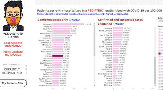 Florida’s pediatric hospitalization rate rose from 19th worst on December 30th to 15th worst on January 7th (from 2.82/100,000 to 4.82/100,000):