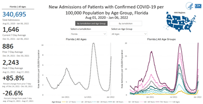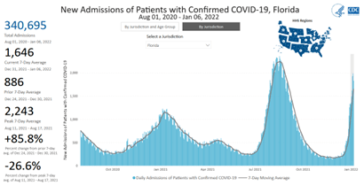 For August 1, 2020–December 30, 2021, Florida has had 340,695 new admissions for Covid patients. This represents 8.9% of all Covid admissions in the US for 6.6% of the US population: