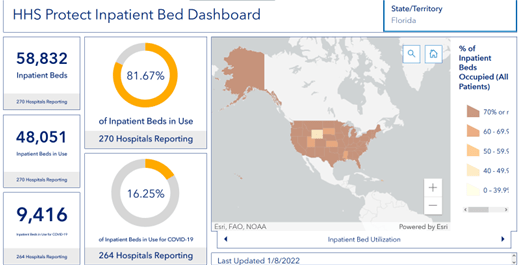 HHS tracks Hospital Utilization. On January 7, 2022, 82% of hospital beds in Florida were full, up 4% from last week. Covid patients accounted for 9,416 of them (16% of utilized beds, up by 9%). Last week, there were 4,933 hospitalized Covid patients, making this an increase of 91%: