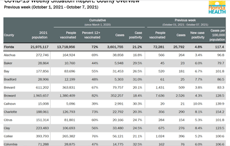 The chart for October 1–7, 2021 is from a screenshot because Florida is immediately removing all traces of older Covid data when the new data is put online: