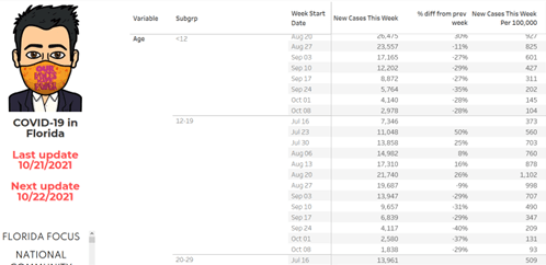 A professor from the University of South Florida has been compiling data from the state since May 28th. Here is what he has posted about pediatric cases since then until October 8th. I have omitted the earlier weeks to fit the data into one screenshot: