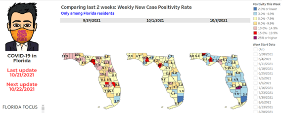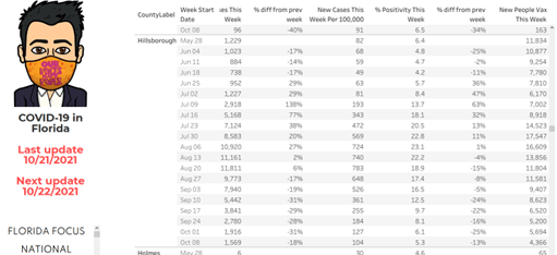 You can click on the maps for detailed information on each county. He also lists the data for each week since May 28, 2021, when Florida deleted its daily dashboard.