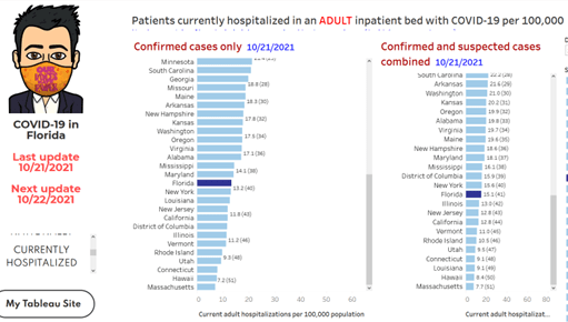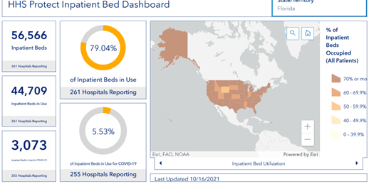 HHS tracks Hospital Utilization. Searching by facility does not include the number of Covid-19 patients. However, after scrolling down to Inpatient Bed Utilization by State, you can choose Florida. On October 16th, 2021, 79% of hospital beds in Florida were full, the same as the past two weeks. The 3,073 Covid patients accounted for 6% of utilized beds, an improvement of 1%.