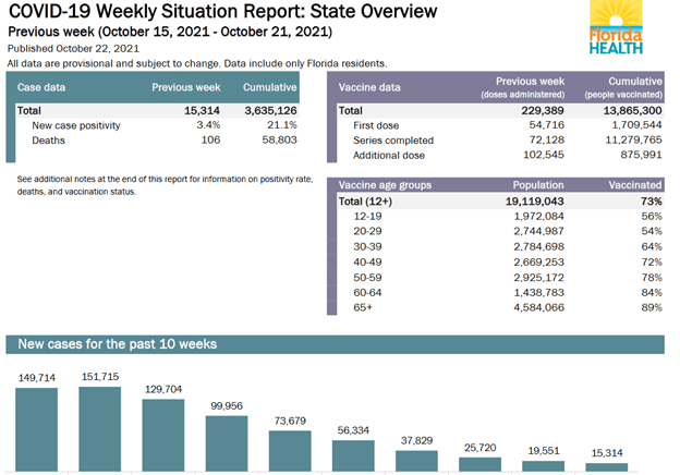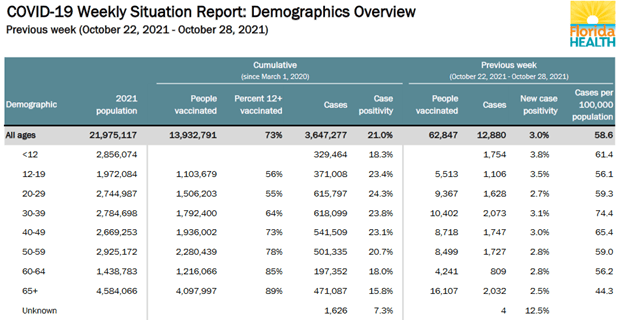 The data from October 15–21, 2021 came from Dr. Salemi’s archives, as my browser would not download the FL Dept of Health Weekly Report, citing it as a security risk: