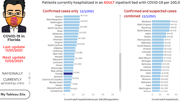 Seven weeks ago, Florida had the highest adult hospitalization rate in the US. Over the past week, Florida improved from the fortieth worst hospitalization rate for adults in the nation to the forty-fifth worst on November 1st (from 12.8 to 9.2/100,000).