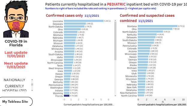 Florida’s pediatric hospitalization rate rose from 30th worst on October 21st to 28th on November 1st (0.87 to 0.73/100,000).