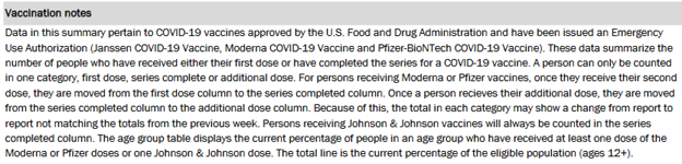 The vaccination rate of 73% represents only those eligible for vaccination. It includes partially vaccinated people. Florida’s population is currently 21,975,117, so 55.5% have at least completed a vaccination series. People who receive a booster shot are removed from the Series Completed Category and added to the Additional Dose Category.