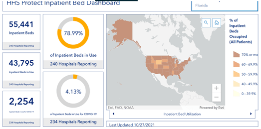 HHS tracks Hospital Utilization. Searching by facility does not include the number of Covid-19 patients. However, after scrolling down to Inpatient Bed Utilization by State, you can choose Florida. On October 27h, 2021, 79% of hospital beds in Florida were full, the same as the past four weeks. The 2,254 Covid patients accounted for 4% of utilized beds, just as ten days ago.