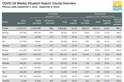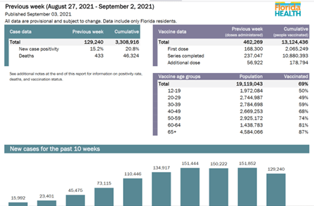 The chart for August 27–September 2, 2021 is from a screenshot because Florida is immediately removing all traces of older Covid data when the new data is put online: