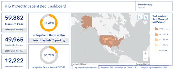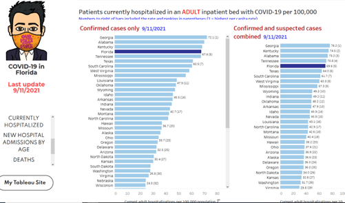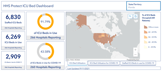 However, after scrolling down to Inpatient Bed Utilization by State, you can choose Florida. On September 11th, 2021, 83% of hospital beds in Florida were full. The 12,222 Covid patients accounted for 21% of utilized beds.