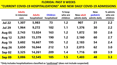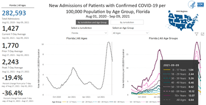 For August 1, 2020–September 9, 2021, Florida had 282,593 new admissions for Covid patients, with a daily average of 1,770 new admissions over the past seven days (an increase from 1,757 the previous week). Every age group declined, with pediatric admissions down by 19.4%.